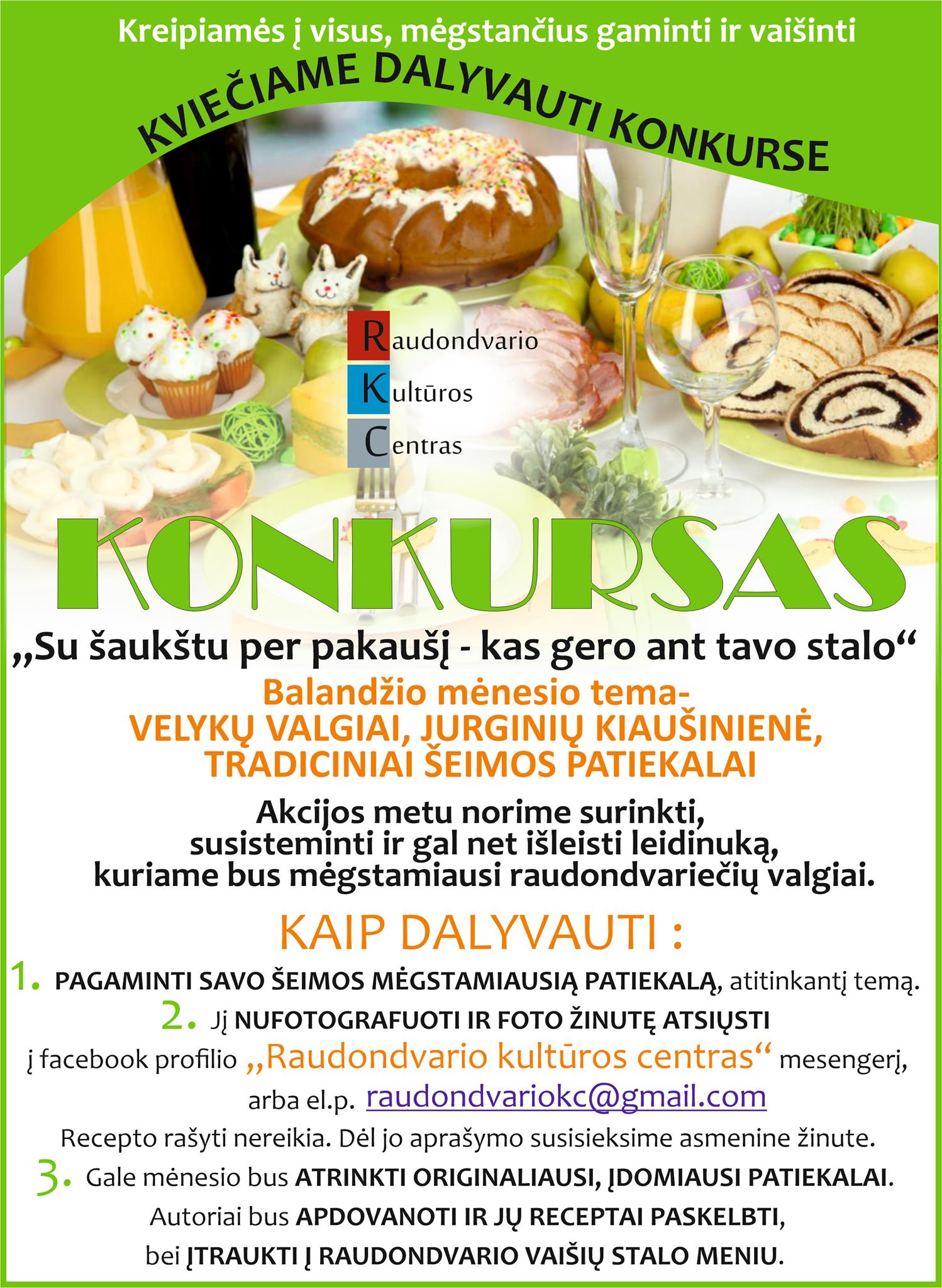 Kai gaminsite patiekalus velykiniam stalui, nepamirškite juos nufotografuoti ir atsiųsti mums į el.p raudondvariokc@gmail.com arba į Raudondvario kultūros centro Facebook puslapio mesengerį. Dėkojame visiems, kurie tai jau padarė kovo mėnesį. Jau turime įdomių receptų raudondvariečių mėgstamiausių šeimos patiekalų katalogui. Siųsti galite ne po vieną nuotrauką.