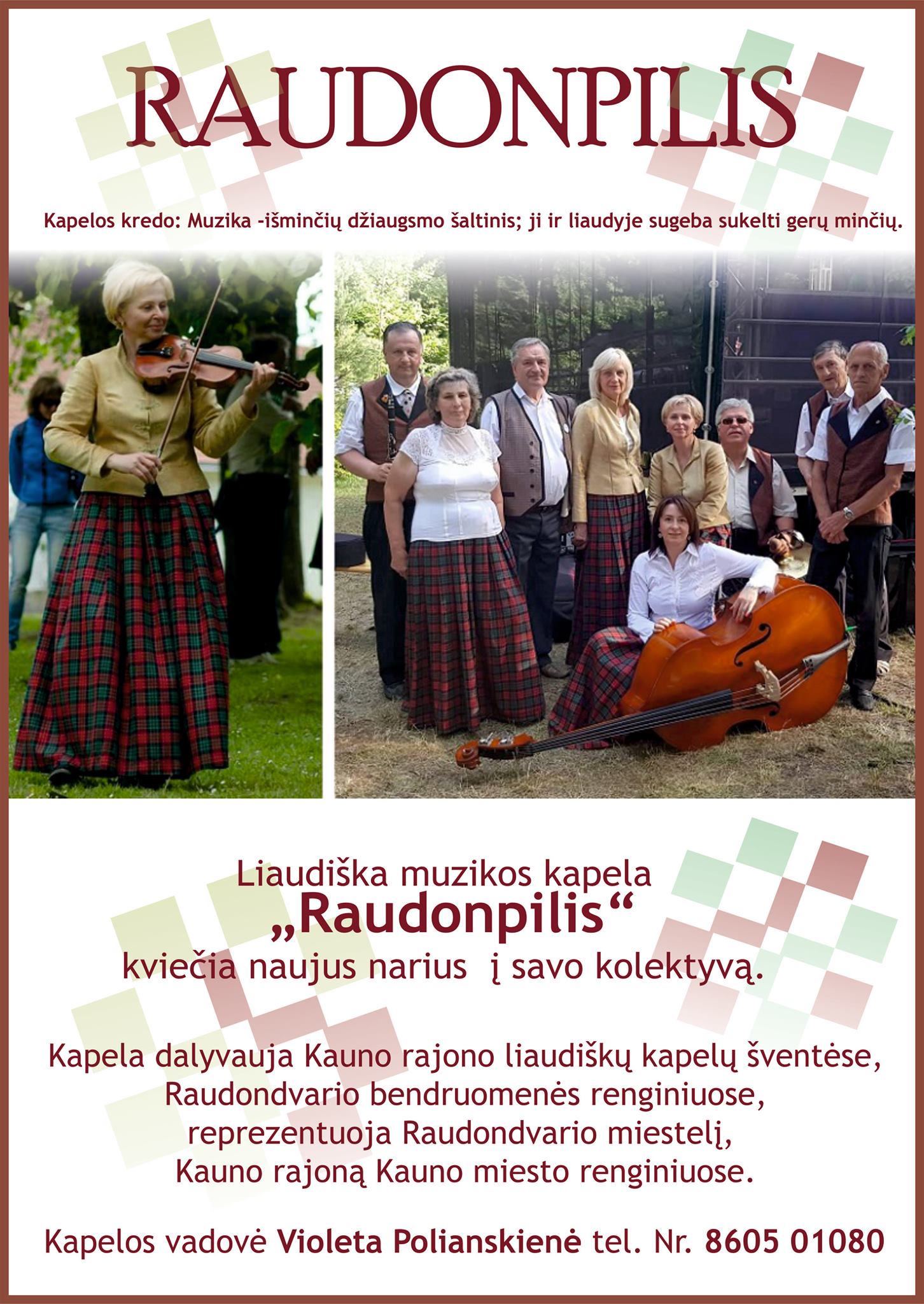 Jeigu kažkur kampe dulka seniai liestas instrumentas, nupūskite dulkes ir ateikite. O gal mėgstate dainuoti ir norite būti išgirsti? Tada taip pat laukiame jūsų. Paskambinkite vadovei ir susitarkite dėl pirmos repeticijos. Užsiėmimai vyksta Raudondvario kultūros centre.